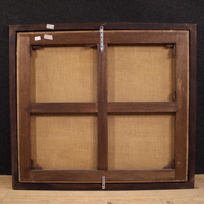 A painting of great decorative impact and rare elegance, ideal for refined, classic or contemporary settings. The spectacular 19th-century frame is made of finely carved and gilded wood, with some signs of aging. The work has already been restored with re-lining, replacement of the stretcher, and repainting in small areas. Overall, it is in good condition. Internal dimensions: H 89 x W 100.5 cm.
