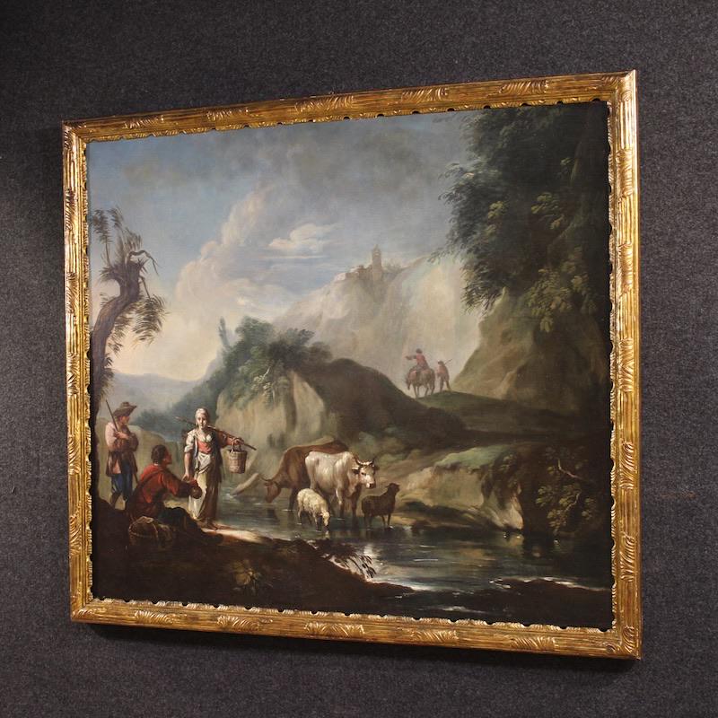 An important Italian painting from the mid-18th century. Oil on canvas artwork depicting a charming landscape animated by peasant figures and animals by a stream. A painting of remarkable pictorial quality, it features a refined perspective construction that draws the eye toward a hilltop village dominated by a tower.