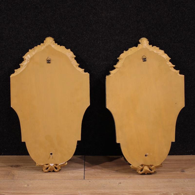 A pair of Italian wall lamps from the 1960s. Finely crafted, lacquered, and gilded antique Louis XVI-style furniture of excellent quality. The two-light wall lamps features wrought iron arms, also crafted and painted. The electrical system needs to be revised. These beautifully sized and proportioned wall decorations can easily be placed anywhere in the home, making them ideal for antique dealers and interior decorators. The tasteful floral decoration with a central gilded basket is beautifully executed. In good condition.