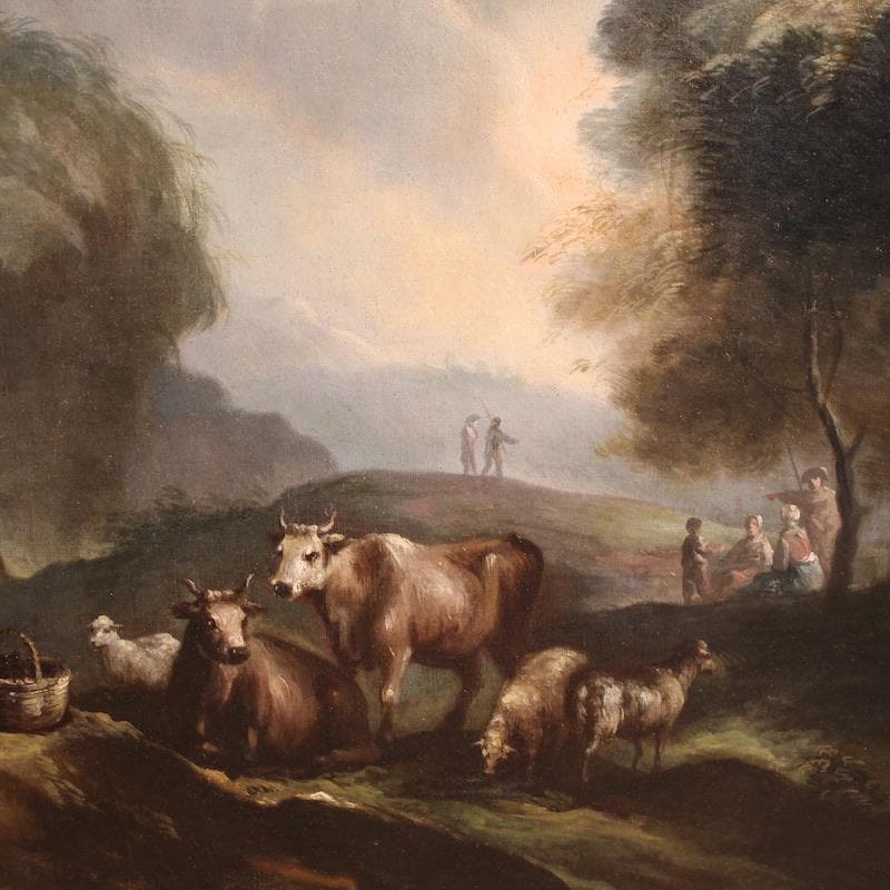 The artwork is attributed to the great painter Francesco Antoniani (1700-1775) due to its fusion of landscape and genre scene, its narrative vivacity, and its soft, diffused rendering of light. The brushstrokes are loose yet controlled, with particular attention to the rendering of animals and atmospheric transitions, distinctive elements of Northern landscape painting of the time (the painting is not currently accompanied by an expertise, but one can be requested upon payment of the relevant additional costs). From 1743, he worked for the House of Savoy, becoming a key figure in the decoration of Piedmontese royal residences. He was renowned for his landscapes, seascapes, and architectural capriccios, and his technique is characterized by lively brushstrokes and refined plays of light.