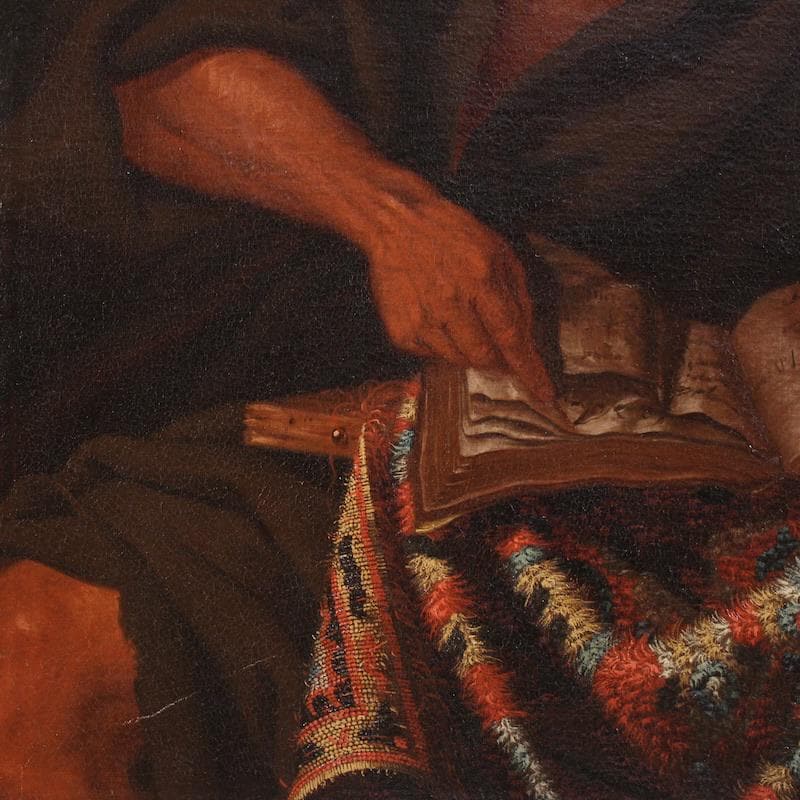 The painting is distinguished by its strong chiaroscuro, reminiscent of Caravaggio, and its intense naturalistic rendering, elements that blend with refined attention to material details, such as the precious polychrome drape on which the volume rests. Particular attention has been paid to the rendering of this marvelous carpet, an element that lends the work remarkable chromatic and decorative richness.