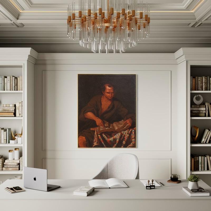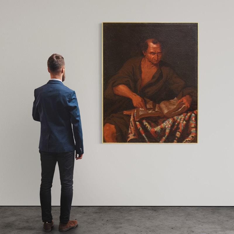 An important 17th-century Italian painting. Oil on canvas artwork depicting a rare and fascinating subject: a philosopher in his study. The composition features an elderly male figure captured in the act of reading, bathed in a warm, grazing light that beautifully highlights his lined face and gnarled hands.