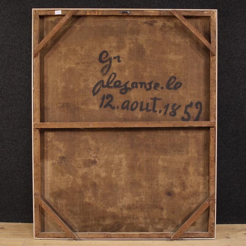 A painting of excellent pictorial quality, attributable to mid-17th-century Central-Northern Italian painting. A visually striking painting, with a subject ideal for cultured and elegant settings, perfect for professional studios or libraries. The 20th-century gilded wood frame is beautifully decorated, with some signs of aging. The painting has already been restored with re-lining, replacement of the stretcher, and restoration of the color in small areas. Overall, it is in good condition. Internal dimensions: H 124.5 x W 98.5 cm.