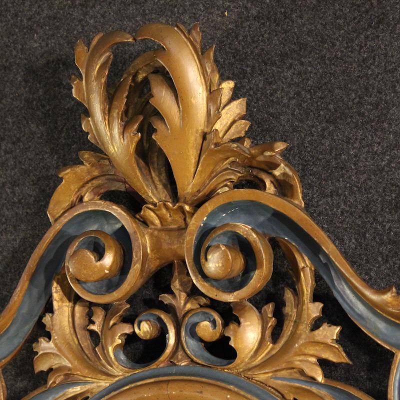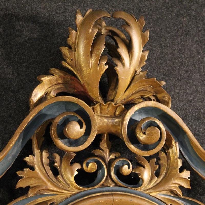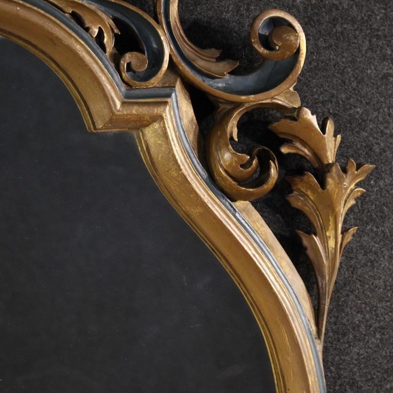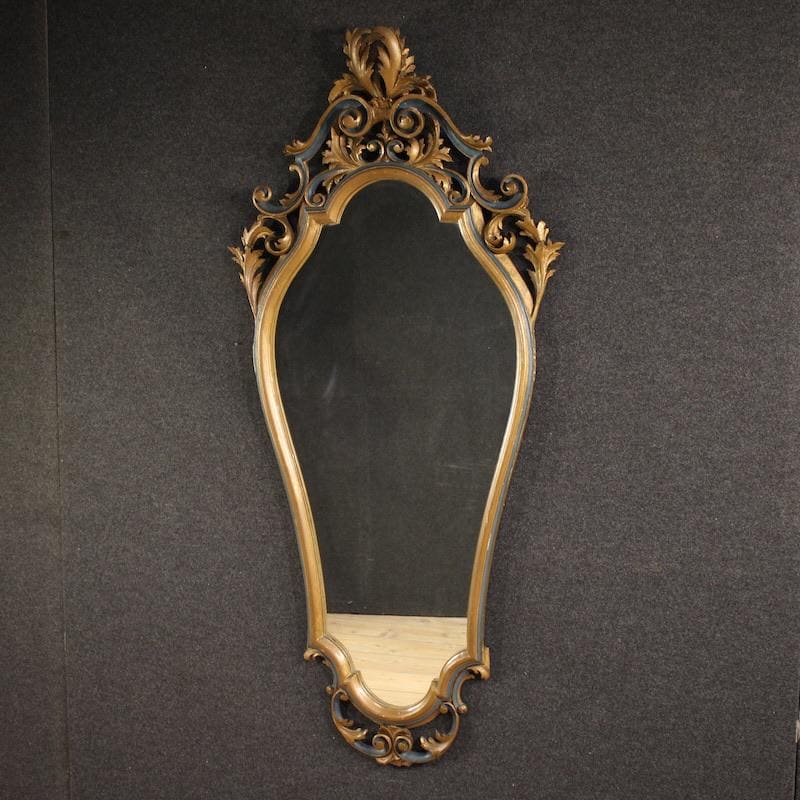 Great mid-20th-century Italian mirror. A large and striking furniture of carved, lacquered, and gilded wood (bronze finish) in the Louis XV style. The mirror features a distinctive shape and proportion, complete with a perfectly reflective mirror. This piece of furniture can easily be placed anywhere in the home, requiring a sturdy anchor given its weight (approximately 25-30 kg). The finely carved cymatium is adorned with a rich floral and scroll decoration, and is of excellent quality. This furniture is suitable for antique dealers and interior decorators, structurally sound and solid, and in overall good condition.