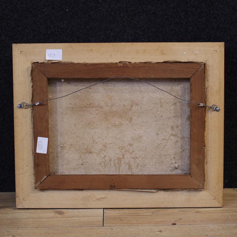 Mid-20th-century Flemish painting. Oil on canvas artwork depicting a bucolic landscape of good pictorial quality. A small painting adorned with a beautifully decorated carved, silvered, and lacquered wooden frame. Signed lower left, Tom Dibbets (see photo), currently being studied, missing additional documentation. A beautifully proportioned painting, it would easily fit into various locations in the home, ideal for antique dealers and collectors of Dutch landscapes. In good condition. Internal dimensions: H 28 x W 39 cm.