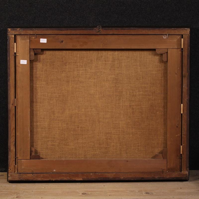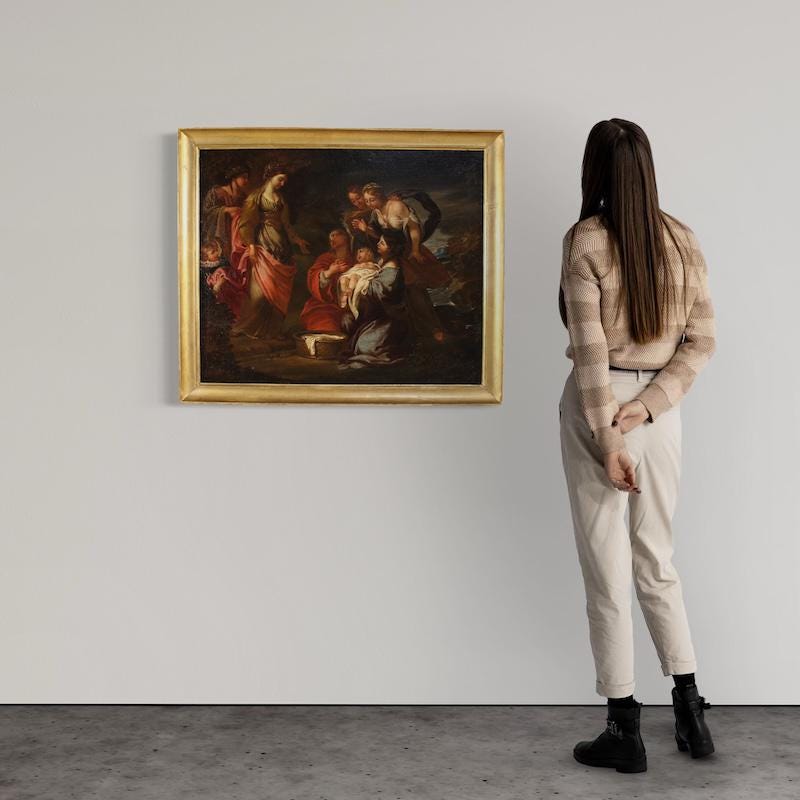 Antique Italian painting from the second half of the 17th century. Artwork oil on canvas depicting a biblical subject, Moses saved from the waters, of excellent pictorial quality. The painting unfolds horizontally, beautifully scaled and proportioned, and is adorned with a non-contemporary carved and gilded wooden frame (gilding restored during restoration).
