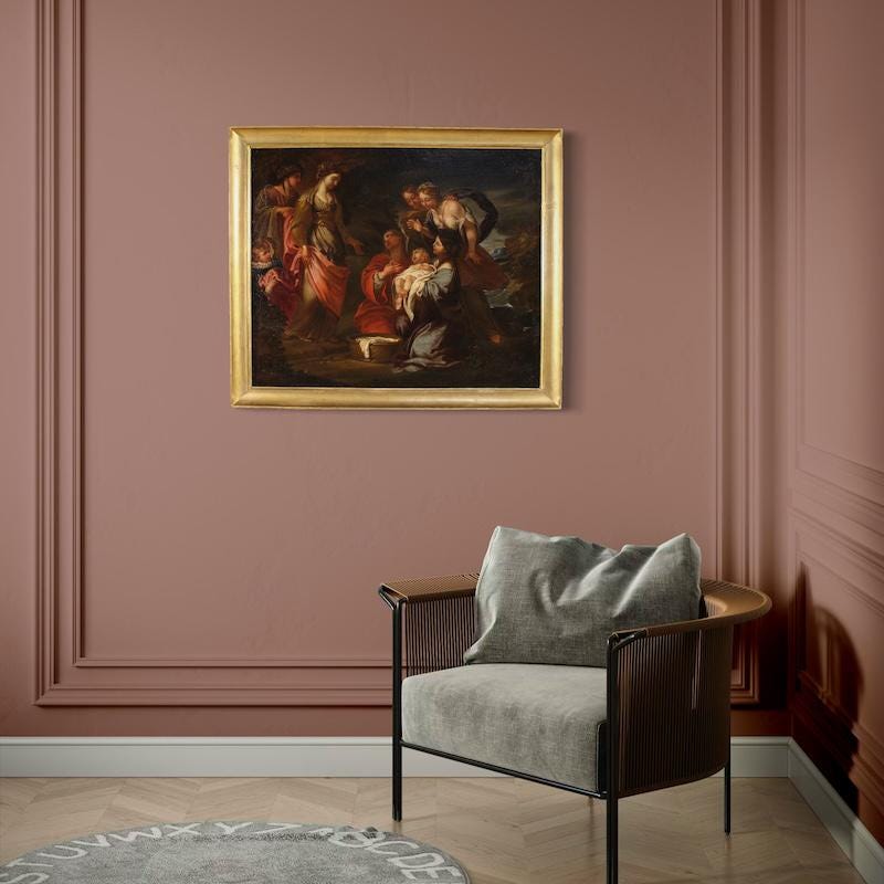 The painting depicts the rescue of Moses by Princess Bithia, daughter of the Pharaoh. Along with the princess, the painter includes four elegant young women holding the child, just removed from the woven wooden basket. To Bithia's left, a young page boy holds up her robes and a counselor with a distinctive headdress enriches the scene (see photo).