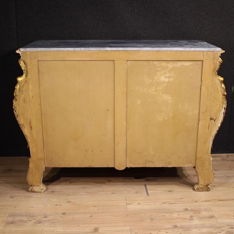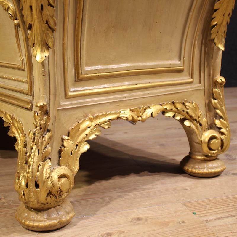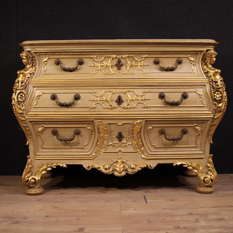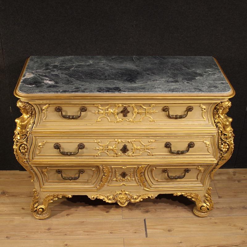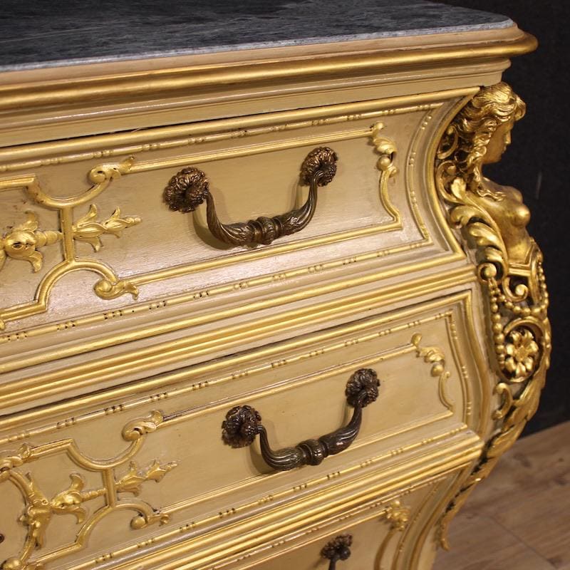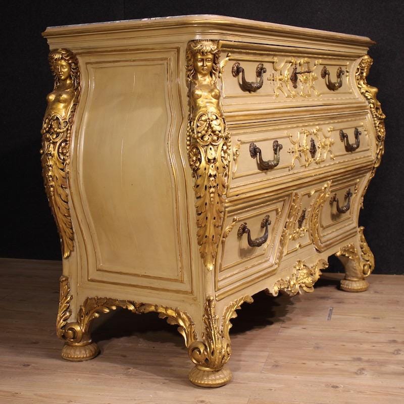 Italian chest of drawers from the first half of the 20th century. A curved furniture, crafted from finely carved, lacquered, and gilded wood with four lateral caryatids. The commode features three spacious drawers and a built-in marble top of excellent size and quality. A fabulously decorated dresser, ideal for an important living room or bedroom, it's a must-have for antique dealers and interior decorators.