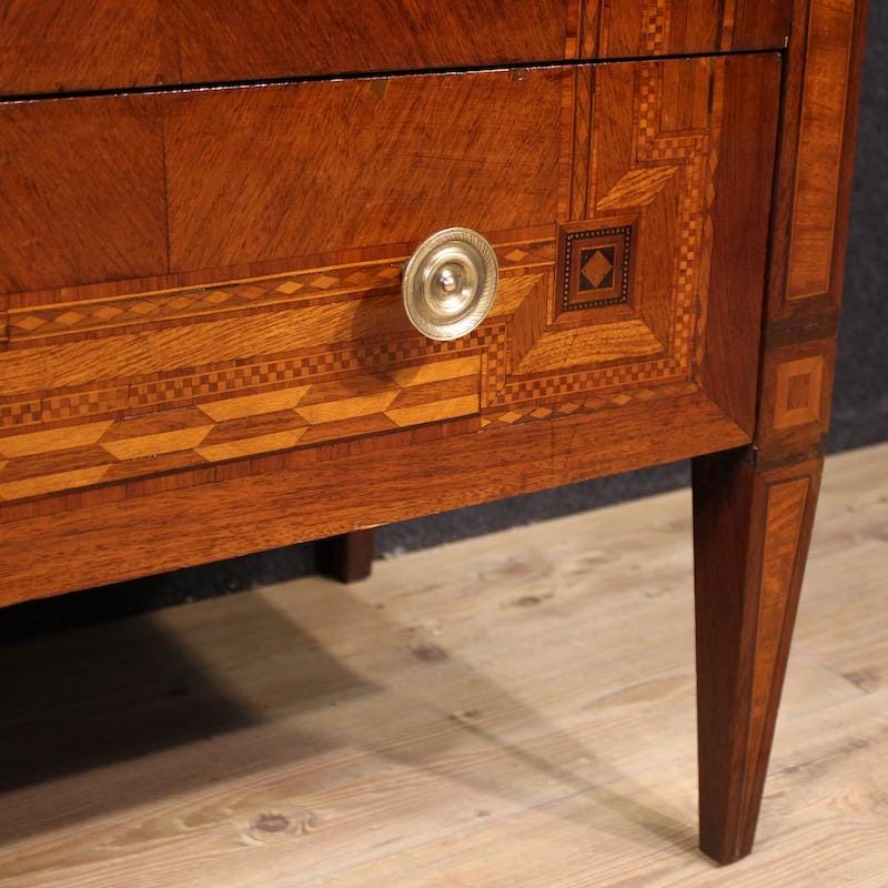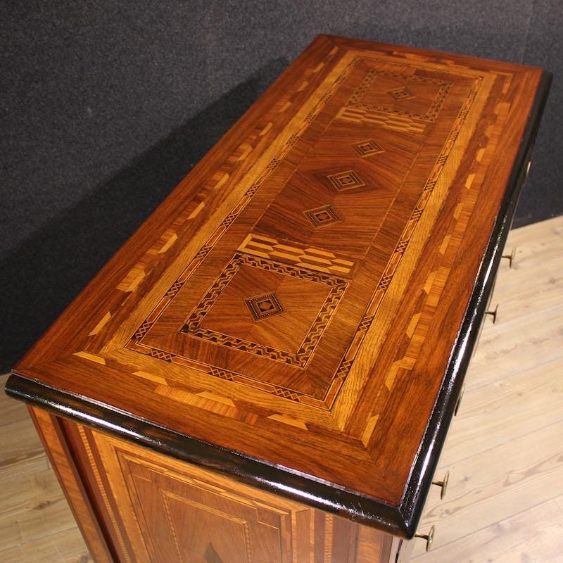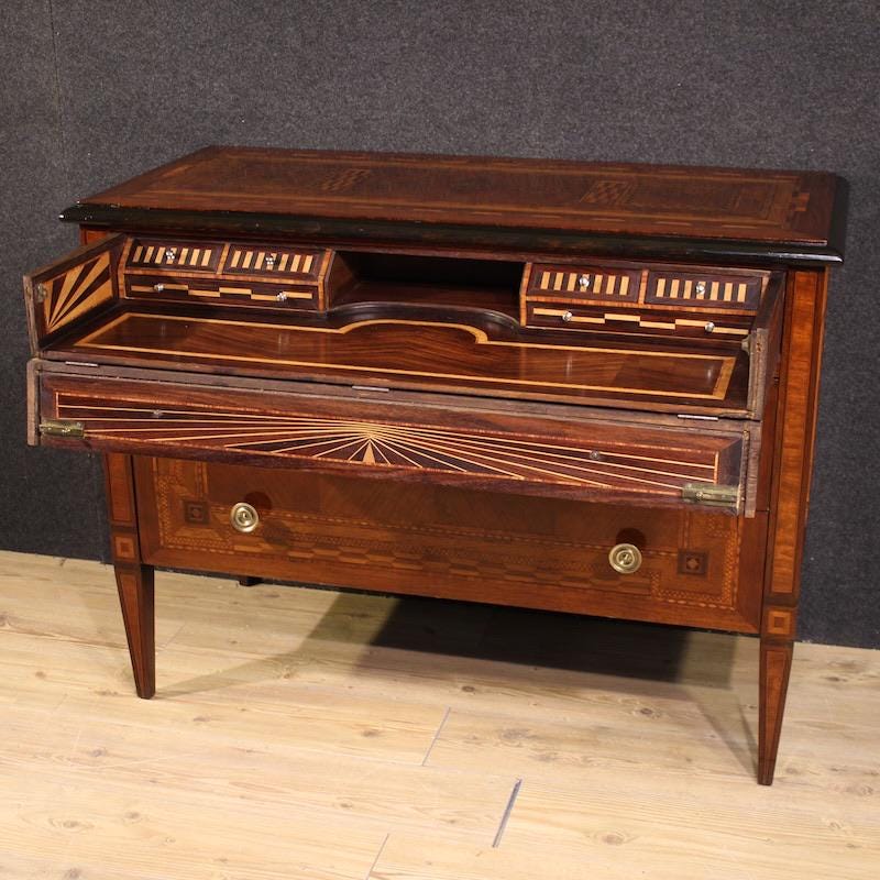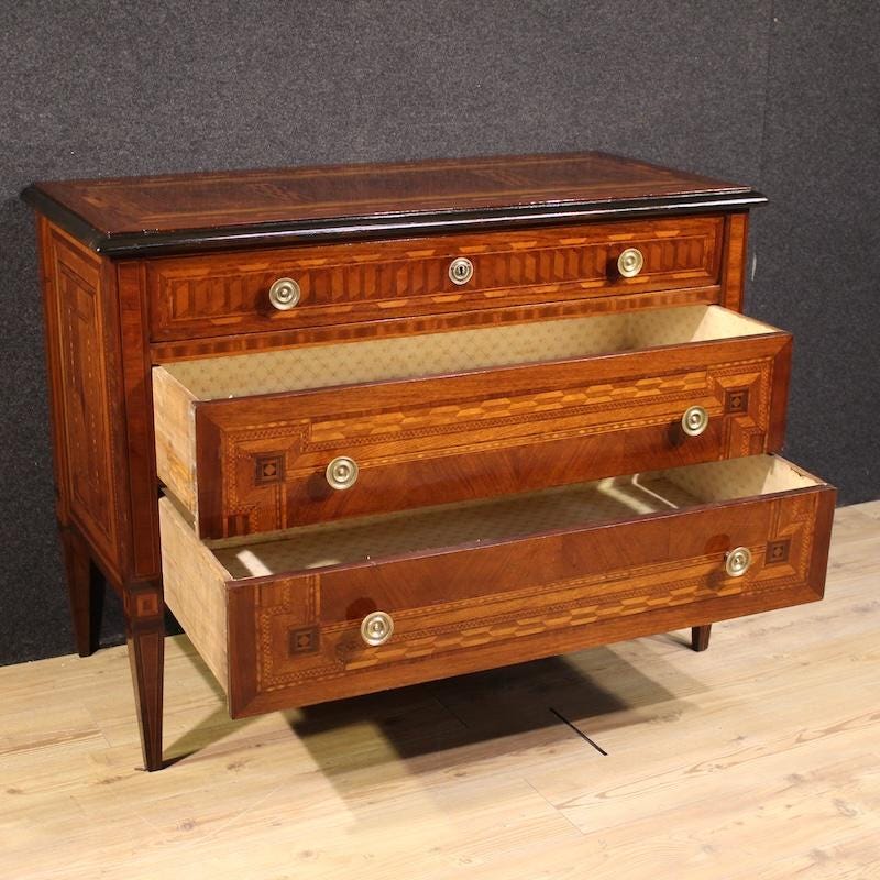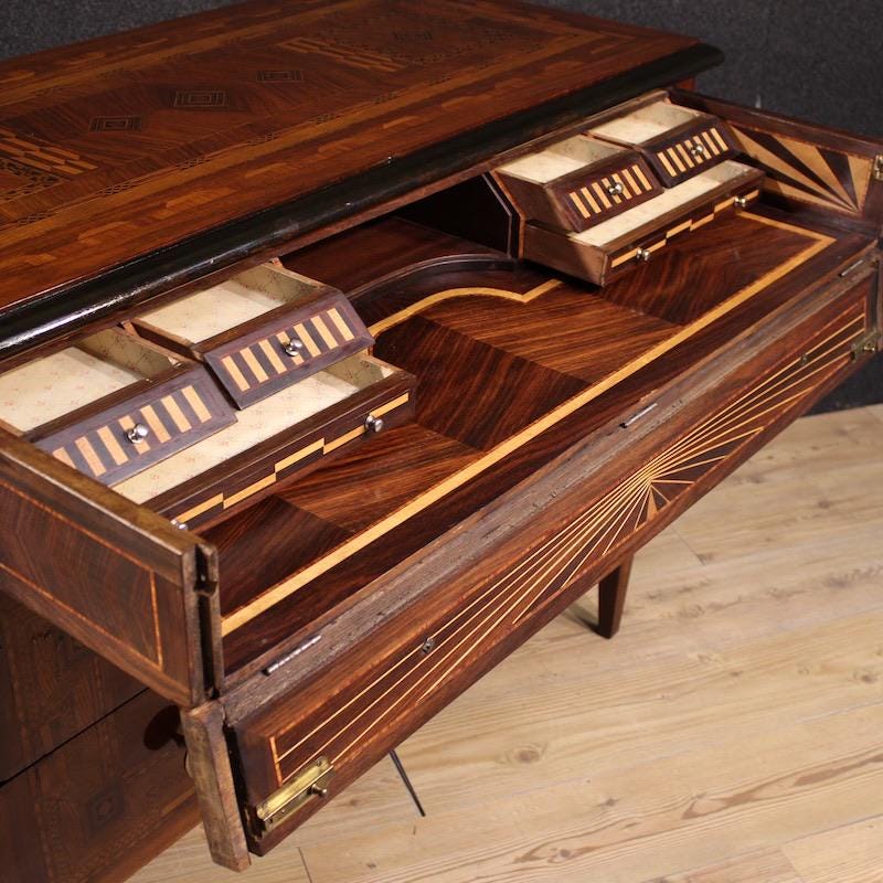 Mid-20th-century Italian chest of drawers. Finely veneered and inlaid with geometric decorations in walnut, rosewood, maple, ebonized wood, beech, and fruitwood, this Louis XVI-style commode features three drawers, two of which are generously sized at the bottom. The top drawer conceals an inlaid writing surface and six small drawers (see photo).