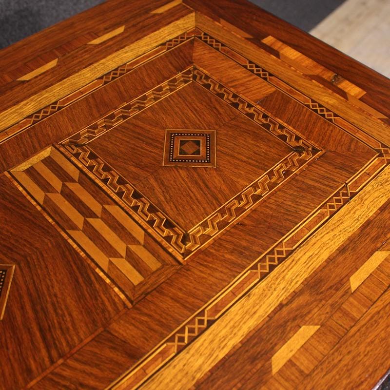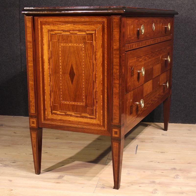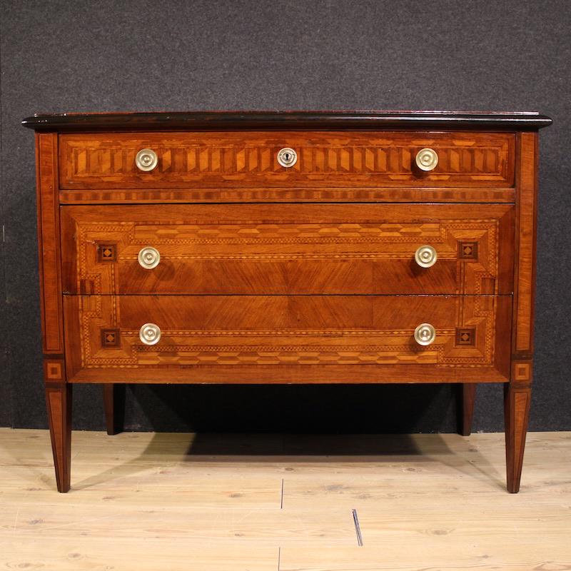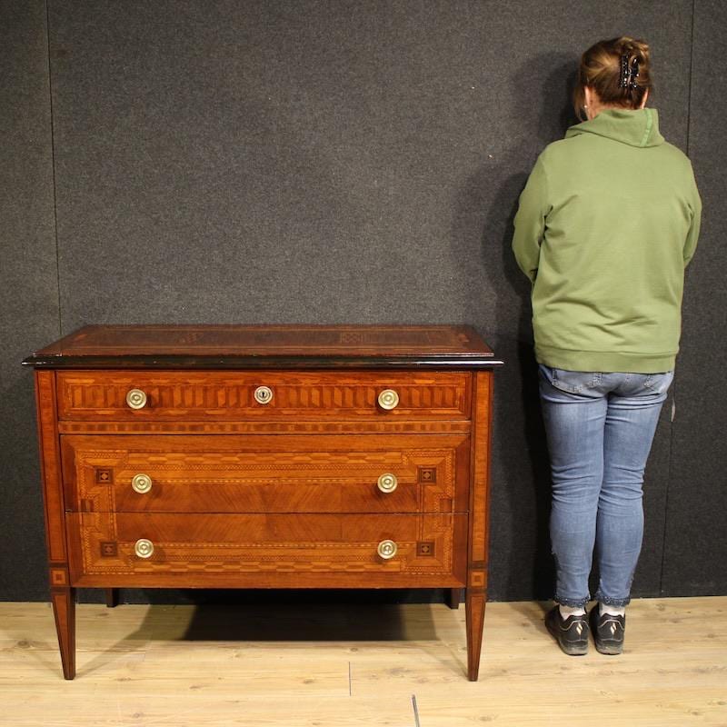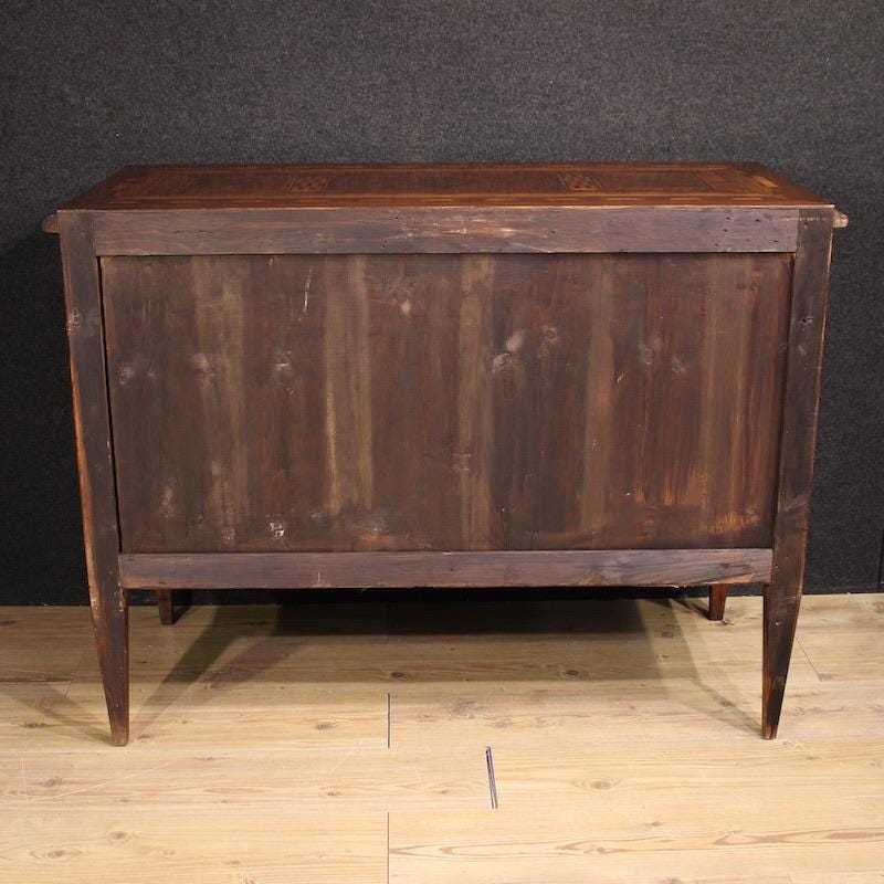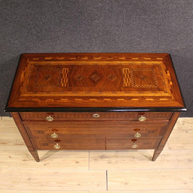 Mid-20th-century Italian chest of drawers. Finely veneered and inlaid with geometric decorations in walnut, rosewood, maple, ebonized wood, beech, and fruitwood, this Louis XVI-style commode features three drawers, two of which are generously sized at the bottom. The top drawer conceals an inlaid writing surface and six small drawers (see photo).