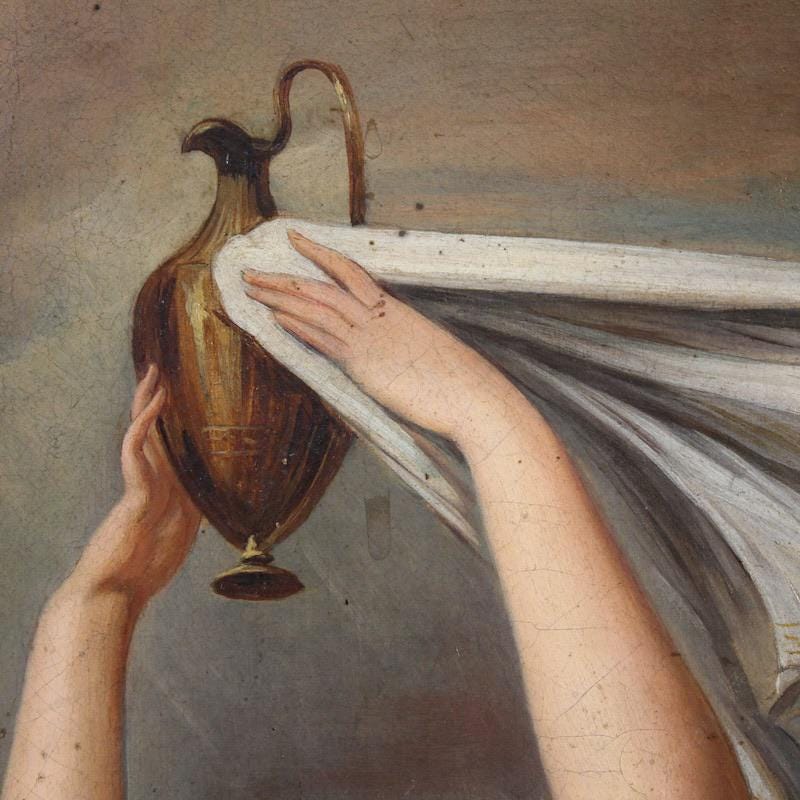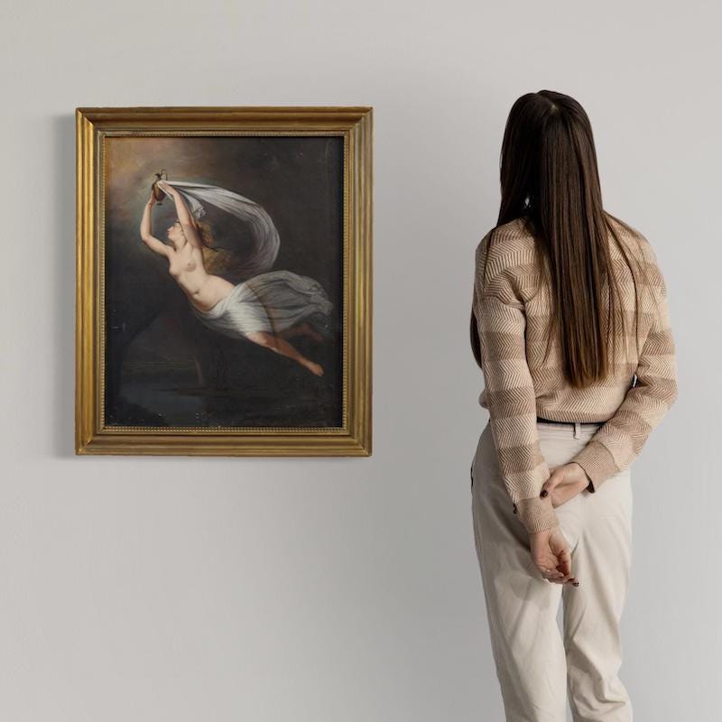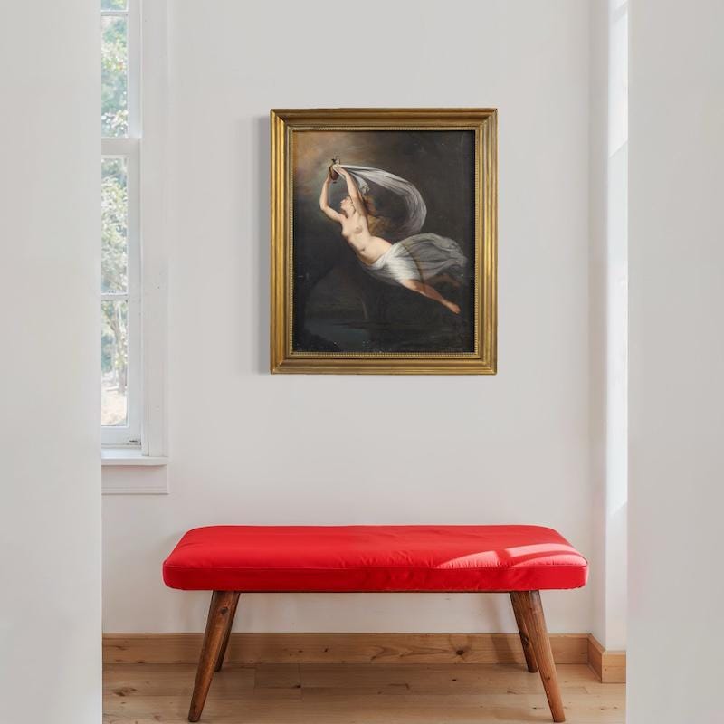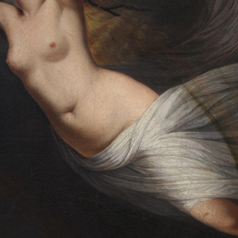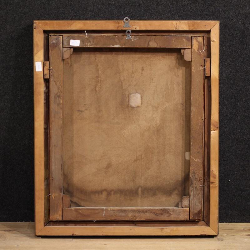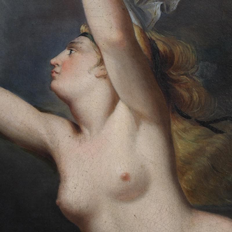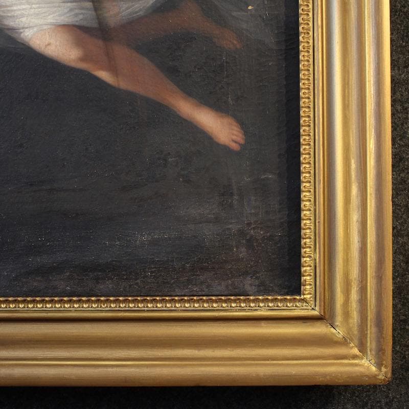 Perfectly proportioned, this painting would easily fit into any room in the home, making it a favorite with antique dealers and collectors. The canvas has some old conservative restoration work, with a patch visible on the back (see photo). Of great quality and elegance, the classical subject is finely crafted, respecting the original's layout. With a beautiful patina, it is in good condition. Internal dimensions: H 67 x W 55 cm.