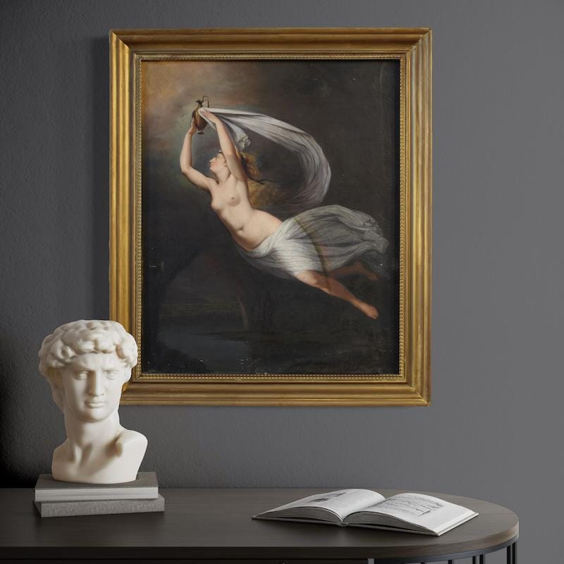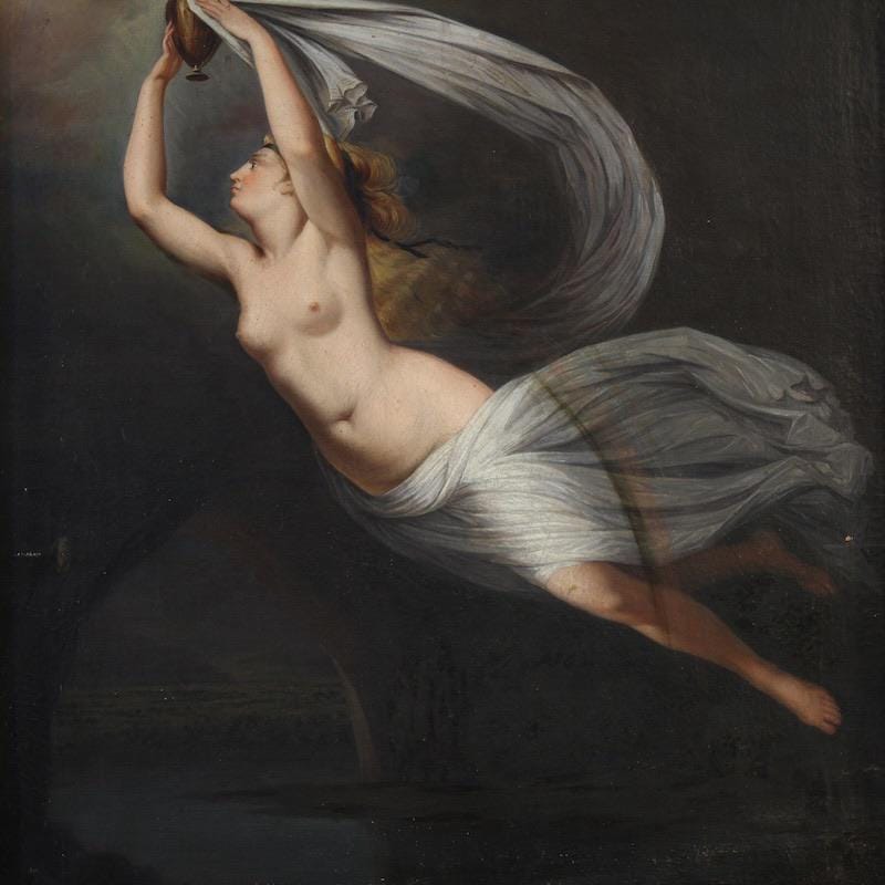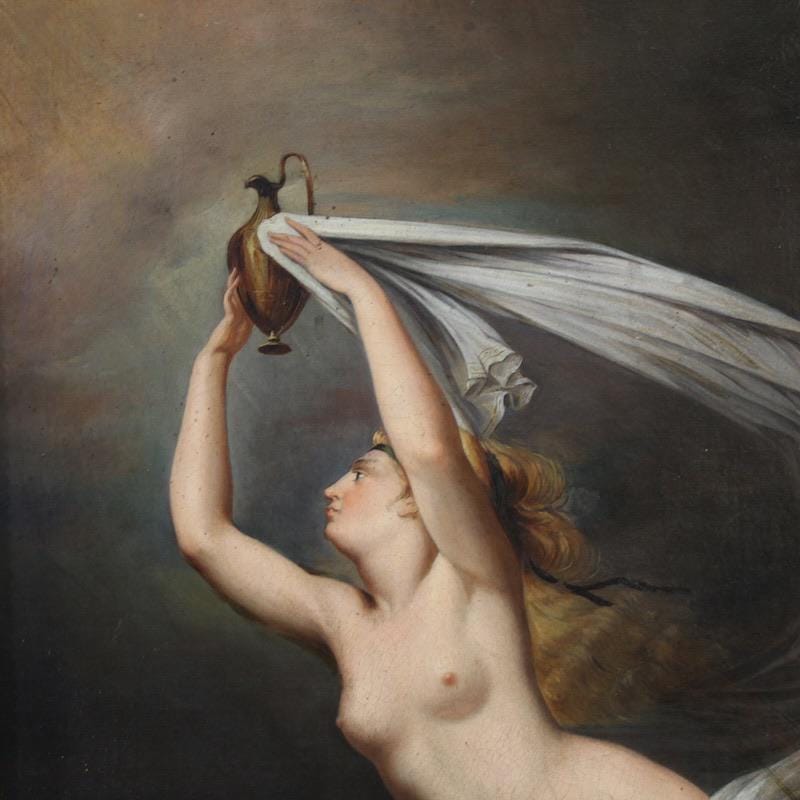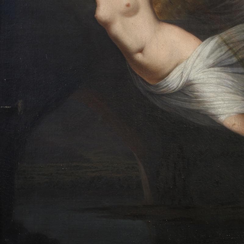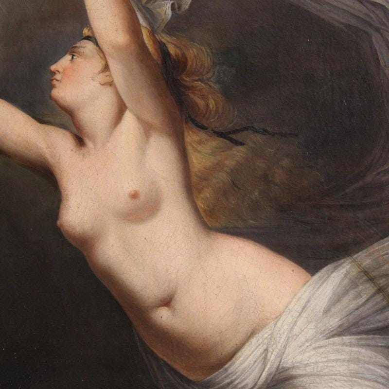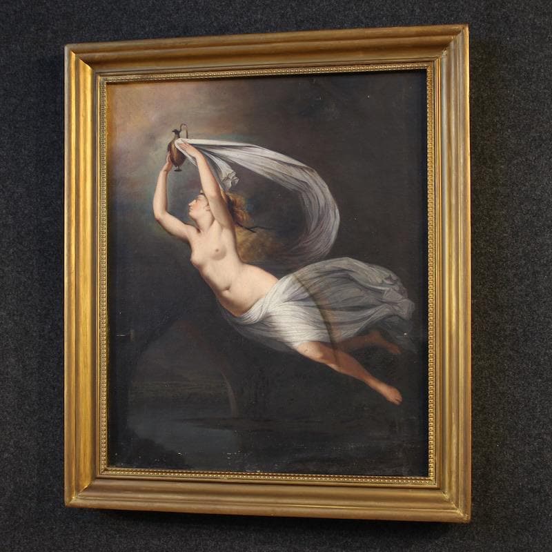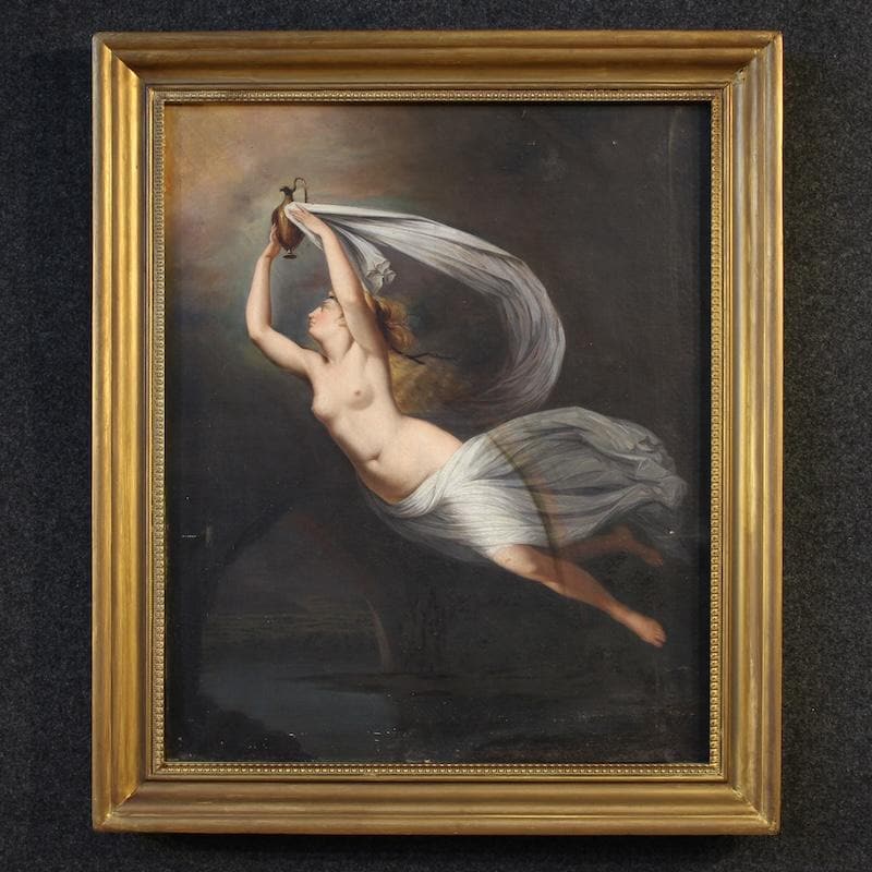 Antique Italian painting from the second half of the 19th century. An antique copy of Guy Head's famous late 18th-century masterpiece, "Iris Carrying Water from the River Styx to Olympus for the Oath of the Gods," of excellent pictorial quality. This artwork oil on canvas, on its first canvas, replicates the original painting in subject and size, now exhibited at the National Gallery of Scotland. The beautifully decorated 20th-century carved and gilded wooden frame is a perfect fit.